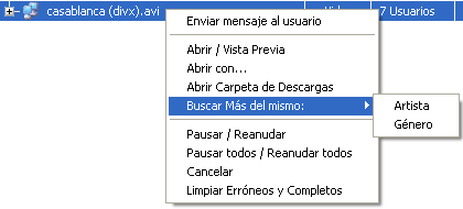4-Reproductor de películas y músicaAlgunos usuarios cambian el título de un archivo por otro que no tiene nada que ver con su contenido. A los archivos incorrectamente titulados se les llama en inglés " fake " (engaño). Por esta práctica, cuando uno intenta descargarse una comedia puede terminar con una película porno, o cualquier otro contenido no deseado. Así pues, es interesante comprobar que un archivo de música o video que estamos descargando, es realmente el que indica su título y no otro. Para reproducir una película o música descargada (o incluso a medio descargar), lo haremos desde la ventana de descargas, haciendo clic derecho sobre el archivo, y eligiendo " Abrir/Vista Previa ". Si es un archivo de música, en la parte inferior de la misma ventana de descarga podremos ver la consola cpn los botones habituales de reproducir, pausa, detener, etc, la barra que indica la posición, el botón para cambiar el volumen, la lista de reproducción, los tiempos de reproducción y total, y el título del archivo: Si reproducimos un archivo de video, para verlo debemos usar el botón "reproductor" para ir a la ventana adecuada, donde podremos ver la parte del video ya descargada. Disponemos de varios botones para ajustar el " Zoom ":