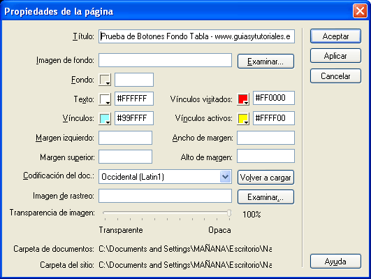 En la siguiente imagen puedes ver los cambios que hemos realizado en el menú "Modificar-Propiedades de la Página", para cambiar los colores del texto y los enlaces (vínculos, vínculos visitados y activos):
