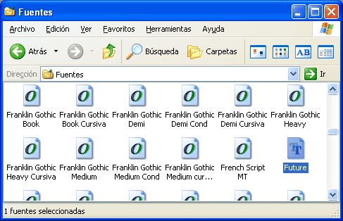Al abrirla, vemos la lista de fuentes que tenemos instaladas en nuestro ordenador. Los iconos con una "O" indican una fuente "Open Type", y los que tienen "TT" son "True Type":
