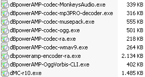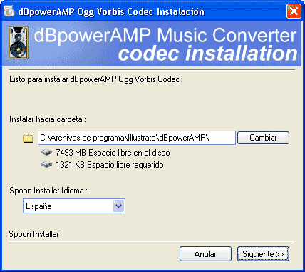 5-Instalar un nuevo codecSi deseamos utilizar o convertir un formato de archivo musical que no soporta dBPowerAmp originalmente, basta con acudir a Codec Central, elegir el formato deseado, y descargarlo. Es habitual que, al descargar un archivo musical de internet, por ejemplo, de una red p2p, mediante programas como Ares (ver mi Tutorial de Ares-p2p), el formato del archivo descargado no sea necesariamente uno de los más populares, por lo que será necesario convertirlo. Pero dbPowerAmp no dispone de la capacidad para convertir todos los formatos cuando se descarga, por lo que será necesario descargar los codecs apropiados para el fichero que deseamos convertir. Aquí vemos el tamaño y nombres del programa y varios codecs: Una vez descargado, la instalación es muy sencilla: basta con ejecutar el programa deseado, y aparecerá una pantalla como ésta (prácticamente idéntica a la de instalación del progama): Si instalaste el programa en la carpeta por defecto, no debes cambiar nada; en caso contrario, usa el botón "Cambiar" para buscar la carpeta correcta. Tras pulsar siguiente, aparecen otras pantallas con información (basta pulsar siguiente en cada una), y por útlimo, verás una página web comentando las peculiaridades del formato instalado, así como información sobre los parámetros de conversión disponibles (en inglés)
