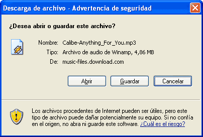 8-c) Descargar una canción gratis de download.comPara descargar una canción debemos pulsar el botón de descarga, de color verde: Al elegir la descarga, aparecerá la ventana típica de descarga de Windows (o el sistema que uno esté utilizando). En el caso de windows Xp, el aspecto de dicha ventana es el siguiente: