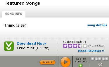A la derecha veremos el número de canciones gratis disponibles " Free Tracks " y podremos reproducirlas todas directamente mediante el botón " Play Now ": Además, una foto y opinión sobre el artista ( Editor's view ), información adicional ( Artist's Description ), localización, género, y una lista de artistas similares disponibles (curiosamente, no están enlazados). El enlace " Visit artist's web site " nos lleva a la página web del artista (fuera de www.download.com ), donde podremos ver más información. Más abajo, la puntuación media del artista según los visitantes (podemos dar la nuestra en " Your Rating ", al pulsar sobre una estrella nos dirá que sólo podemos votar una vez, y si estamos seguros). Bajo " Featured songs ", sale la lista de canciones de este artista, con el nombre, duración, un enlace para ver más información " song details ", y otro para ver las críticas " Read Reviews ", el tamaño del archivo mp3, y la puntuación media de la canción, y el botón verde para descarga (o el texto " Download Now ").