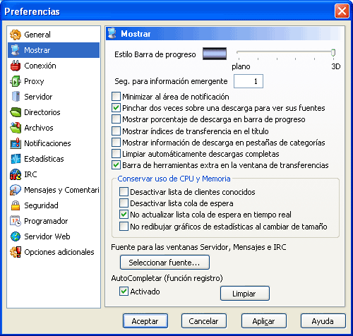 8c) Preferencias de eMule: pantalla "Mostrar".