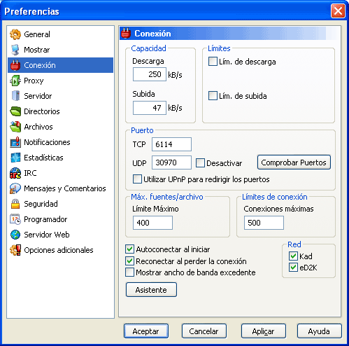 9b) Preferencias de eMule: pantalla "Conexión":