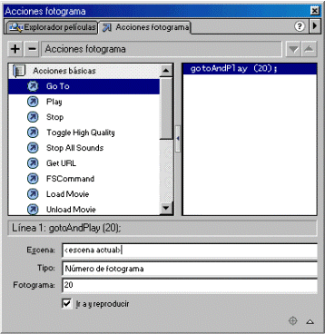 Algunas acciones requieren el uso de diversos parámetros; por ejemplo, para la acción GoTo (ir a) debemos indicar el número de fotograma al que ir, y podemos elegir si además, queremos reproducir desde dicho sitio.