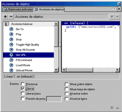 En el fotograma/s deseado/s, insertamos la acción GetURL (Conseguir URL) e indicamos la dirección de la página web deseada (local -datos.htm- o remota www.cursos2001.com), y la ventana o marco donde queremos abrirla. |