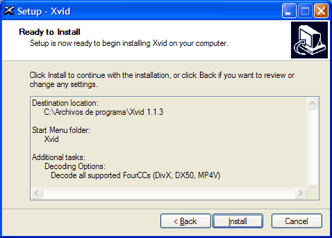 Pulsa Next (siguiente); también lo debes hacer en el resto de pantallas después de elegir las opciones correspondientes. Debes elegir "I accept the agreement" (es decir, que aceptas el acuerdo de licencia, que, como hemos comentado, es gratis). De lo contrario, no podrás proseguir la instalación. La pantalla anterior muestra las características de esta versión. Aquí puedes elegir la carpeta donde instalarás el codec (basta aceptar la que viene por defecto). El nombre del grupo de programas para el menú inicio (también puedes dejar el que trae). Aquí puedes elegir si este codec también se encargará de reproducir archivos comprimidos con DivX, DX5 y MP4V. Activando la casilla no necesitarás descargar ni instalar más codecs para ver la mayoría de tus videos. En la pantalla anterior se muestra la ocnfiguración que has elegido en las anteriores. Pulsa "Install" (instalar) Tras unos instantes donde se irán preparando los archivos, verás la siguiente pantalla: Y ya está. A partir de ahora puedes reproducir tus videos Xvid desde tu reproductor favorito (por ejemplo, el Reproductor de Windows Media), o desde el navegador de Internet.