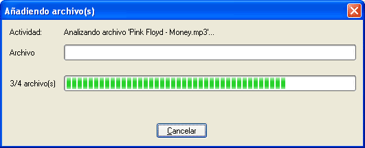 Para añadir los archivos de las canciones deseadas, podemos arrastrarlos desde una ventana de MiPC o el Explorador de Windows, o bien, pulsar el botón "+ Añadir". Las canciones pueden estar guardadas en formatos WAV (sin comprimir) ó MP3 (comprimidos, en cuyo caso Nero se encargará de la correspondiente conversión en tiempo real). Se pueden añadir archivos de uno en uno, o arrastrar carpetas completas, lo que añadirá todo su contenido musical. En la grabación no se respetará ninguna estructura de carpetas, por no ser aplicable a los CD-Audio, ya que todas las canciones son pistas individuales numeradas de la 1ª a la última). Al añadir archivos MP3 ó WAV, aparecerá un cuadro de progreso mientras Nero analiza el archivo. El proceso será más lento en los MP3, porque debe realizar la oportuna conversión: