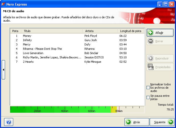 Debemos comprobar que la duración total de las canciones (pistas) no exceda la capacidad del disco (74 ú 80 minutos, depende del disco usado; aunque existen discos de 90 minutos, muy pocos lectores podrán reproducirlos). En la parte inferior, unas líneas verticales nos indicarán la capacidad máxima del disco (amarilla para discos de 74 minutos y roja para los de 80); una barra verde-amarilla-roja y el número de la derecha muestran lo que ocupan todas las canciones (min:seg). La parte roja es la que no cabe en un CD de 80 minutos, y la amarilla la que está entre los 74 y 80 minutos.