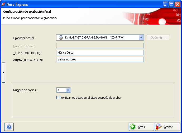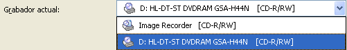 Donde podremos elegir la grabadora (Image recorder es el grabador de imágenes en disco duro, que no graba discos en sí, sino que crea archivos en disco duro que pueden servir para hacer más rápidamente varias grabaciones seguidas del mismo original): En las casillas "Título" y "Artista" podemos teclear los datos que aparecerán en los lectores de CD ó DVD compatibles con "Texto de CD". El número de copias nos permite realizar varias copias seguidas del mismo original. Una vez seleccionadas las opciones deseadas, pulsaremos el botón “Grabar”, que comenzará el proceso de grabación en sí: y se mostrará una pantalla con el progreso de la grabación: