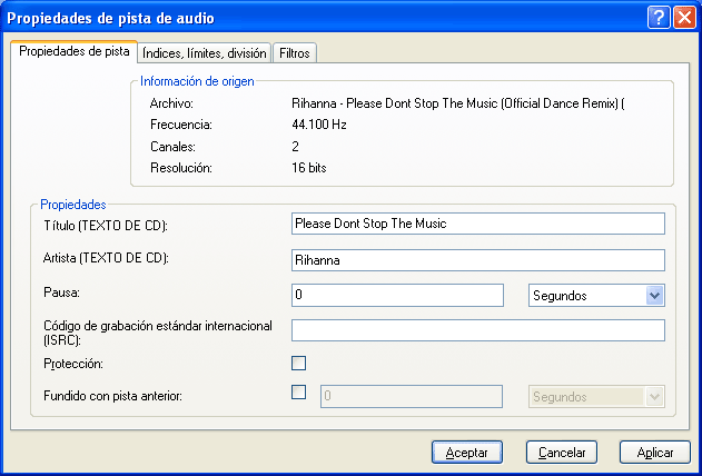 Una vez añadido un archivo, si cambiamos de opinión, podemos seleccionarlo y pulsar el botón "Borrar" o la tecla "Supr" para quitarlo de la grabación (esta operación no lo borra del disco duro). Si no estamos seguros de que el archivo sea el deseado, podemos comprobarlo seleccionándolo y pulsando el botón "reproducir". Podemos seleccionar una pista y pulsar el botón "Propiedades" para cambiar algunos parámetros de esa canción: El cuadro de diálogo de propiedades tiene 3 fichas (Propiedades de pista, Indices límites y división, y Filtros):