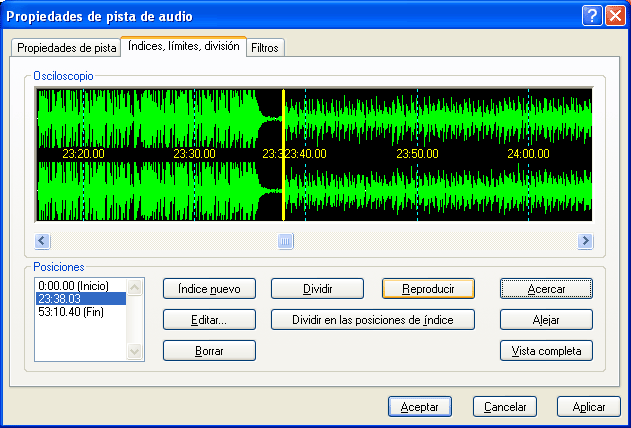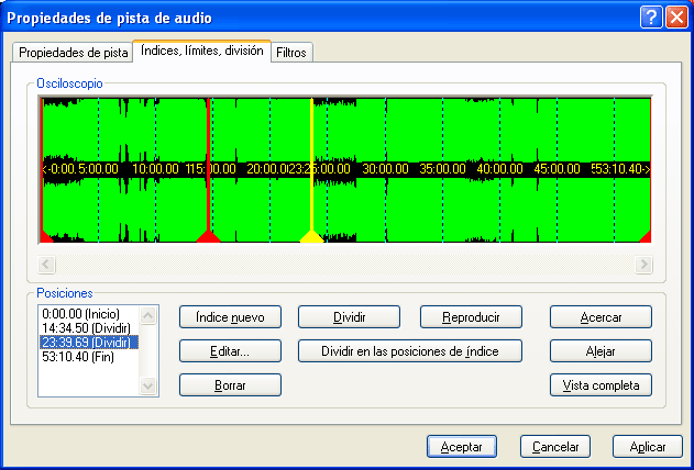 Los límites de la canción permiten recortar parte de ella, si no nos interesa; se modifican arrastrando los triángulos inicial y final. Para dejarlos como estaban, basta arrastrarlos a los extremos. Los puntos de división nos separarán una pista en dos ó más. En la imagen podemos ver los 2 puntos de división que hemos establecido en los minutos 14:34 y 23:39 de la pista 6: