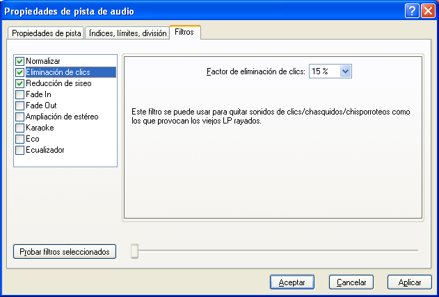 Al dividir una pista (pulsando "Aceptar") aparece un mensaje de confirmación: Tras aceptarlo, vemos que en la pantalla principal las pistas creadas aparecerán con un asterisco junto al nº de pista: Si queremos volver a unir varias pistas previamente separadas, podemos "quitar" los límites de una de ellas y eliminar las demás pistas (las que quedan con "*"). Tras unirlos, nos quedará de nuevo la pista como al principio: En la tercera ficha "filtros" podemos aplicar a la pista uno o varios procesos y efectos de sonido: