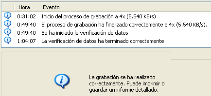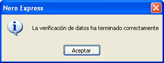 En la parte superior podemos ver todas las fases de la grabación, con el tiempo en que se producen. En la parte inferior izquierda vemos la velocidad de grabación en cada momento, indicada en KB/seg, y en unidades “x” (múltiplos de la velocidad básica). En la parte inferior derecha vemos una estimación del tiempo que falta para terminar la grabación, el tiempo ya transcurrido, y el porcentaje de grabación ya realizada. En cualquier momento, podemos terminar la grabación con el botón “detener”, pero el disco podría quedar inservible. Si la grabación falla en algún momento, Nero emitirá un sonido estilo “abucheo”, se interrumpirá el proceso, y saldrá un mensaje indicando el fallo. Probablemente, el disco quede inservible (salvo que sea del tipo RW). Si hemos activado la verificación, al terminar la grabación, automáticamente se expulsará el disco y se volverá a introducir para realizar la comprobación (no debemos sacar el disco hasta que finalice la comprobación). Cuando termine la verificación (o la grabación, si no habíamos activado la verificación), sonará una melodía de trompeta, y aparecerá un mensaje indicando el resultado positivo: Pulsando el botón “Aceptar”, podremos comprobar la duración de cada fase: Ten en cuenta que un disco 16x se grabará 4 veces más rápido que un 4x (si el grabador y la potencia del equipo lo permiten), pero algunos procesos, como la inicialización y el cierre de la sesión, duran lo mismo, independientemente de la velocidad del disco, por lo que el tiempo total de grabación no es proporcional a la velocidad. Por otro lado, si tu grabadora admite hasta 8x, aunque uses un disco 16x, la velocidad estará limitada a 8x. Al terminar, podemos elegir entre:
