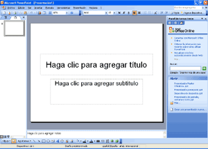 2-Insertar Diapositivas en blanco.Existen varios métodos para crear diapositivas e ir rellenándolas con la información (textos, imágenes) que se desee. Es bastante interesante crear diapositivas en blanco basadas en una plantilla, de modo que sólo sea necesario cambiar los contenidos que trae inicialmente, por los que queramos incluir. Al abrir el programa, aparece una presentación en blanco, con una diapositiva de tipo título: