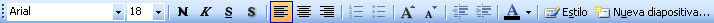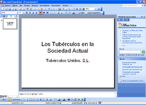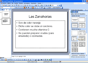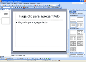 Existen modelos con título y subtítulo, con título sólo, con título y un texto con viñetas, con título y texto en dos columnas, en blanco, con gráficos, texto y gráfico, etc… Para aplicar uno de estos diseños a una diapositiva nueva, basta con hacer clic en el modelo deseado de la parte derecha. El formato del texto puede cambiarse con la barra de herramientas de Formato, o con el menú "Formato-Fuente". En la parte izquierda de la pantalla tenemos (en miniatura) las dispositivas ya creadas. Para ver y/o modificar cualquiera de ellas, basta con elegirlas con un clic, y la podremos ver en grande en la parte central de la pantalla. También podemos copiar y pegar una dispositiva entera, para mantener su estructura, y después cambiar los textos y/o imágenes. Para cambiar el orden de las diapositivas arrastraremos arriba o abajo las miniaturas del panel izquierdo. Si tienes cualquier duda