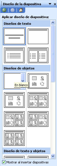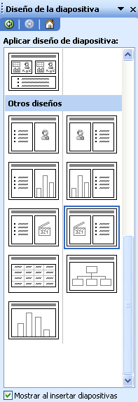 De este modo, podemos ir rellenando diapositivas del mismo estilo (título y subtítulo). Después de usar el botón “Nueva Diapositiva”, en la parte derecha de la pantalla ha aparecido el panel “Diseño de la Diapositiva”, donde podemos elegir entre diferentes modelos de diapositiva. Además de los visibles, existen más que se pueden ver usando la barra de desplazamiento.