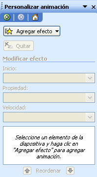 7-Personalizar Animación y Temporización.7a-Personalizar Animación.Mediante el menú “Presentación-Personalizar Animación”, accedemos a un panel de tareas donde podemos aplicar diferentes efectos de aparición y desaparición a cada uno de los objetos de cada diapositiva. Por ejemplo, el título puede aparecer desde arriba, y una imagen mostrarse desde el centro.