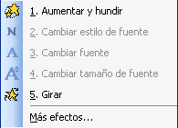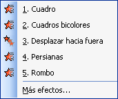 Además de los 5 efectos que aparecen en las tres primeras, hay una opción “Más efectos…”, que nos muestra otra lista, con su propia barra de desplazamiento para ver aún más, como por ejemplo las siguientes: 7b) Temporización de los efectosUna vez insertados uno o varios efectos, en el panel derecho podemos pulsar en la lista desplegable de cada uno para indicarle cuándo queremos que se produzca. Por ejemplo, si debe suceder sólo al hacer clic (o pulsando una tecla), a la vez que el efecto anterior, o después del anterior. Eligiendo “Opciones de Efectos...” podemos elegir la dirección y el sonido asociado: Con “Intervalos...” podemos indicar el tiempo que debe transcurrir antes de cada efecto, la velocidad a la que debe desarrollarse, etc …