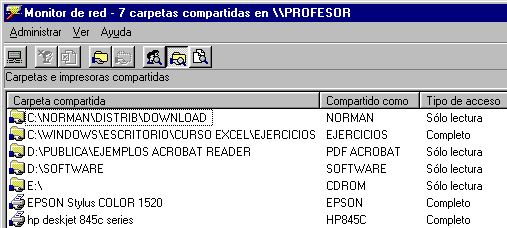 4e-¿Cómo saber qué carpetas tengo compartidas?Windows 98 dispone de un programa llamado "Monitor de Red" que muestra la lista de carpetas compartidas, su ubicación y el tipo de acceso, con el objeto de que podamos gestionrlas cómodamente: