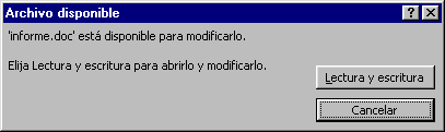 4c-El bloqueo de archivosEn vez de copiar un archivo de otro usuario, podremos abrirlo directamente un haciendo doble clic sobre su icono. En este caso, si dicho archivo está siendo usado por cualquier otra persona en el mismo momento, puede aparecer un mensaje avisándonos que sólo podemos usarlo en modo de sólo lectura (o guardarlo con otro nombre); es decir, lo que abriremos será una copia del original. Por ejemplo, con archivos de Word 2000 aparecería el mensaje: