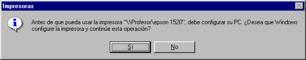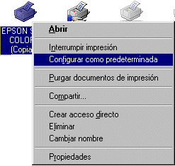 Tras pulsar el botón "Sí", aparece un asistente, que inicia un proceso que copiará los archivos necesarios desde el ordenador que tiene la impresora, y configurará nuestro ordenador para poder utilizar la impresora como si estuviera conectada a nuestro equipo: Al concluir el proceso, en el menú "Inicio-Configuración-Impresoras" podemos ver la nueva impresora disponible: También se puede instalar una impresora de red mediante el icono "Agregar Impresora" que vemos en la imagen anterior; sin embargo, es más fiable y cómodo el método anterior. A partir de este momento, cuando deseemos imprimir, si sólo tenemos esa impresora lo haremos del modo habitual. Si hemos instalado en nuestro PC más de una impresora (pueden ser de red y/o locales), al imprimir debemos seleccionar la impresora deseada para cada ocasión (una de ellas es la predeterminada, la que en el gráfico anterior se muestra una marca en forma de v). Para cambiar la impresora predeterminada, se lo indicamos con botón derecho-"Configurar como predeterminada" Para elegir con qué impresora deseamos imprimir, en vez de pulsar el botón de imprimir, debemos usar el menú "Archivo-Imprimir", y en el cuadro de diálogo resultante, elegir la impresora en la lista desplegable: