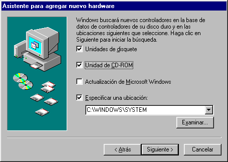 Elegimos la primera opción ("buscar el ...") y pulsamos siguiente. En este punto, quizá necesitemos insertar el disquete o CD incluido con la tarjeta de red, y elegir la carpeta adecuada del mismo. En ocasiones, debemos usar la siguiente pantalla, donde elegiremos el lugar donde hemos insertado el cd o disquete de controladores de la tarjeta de red: