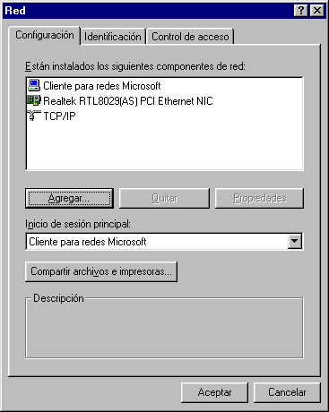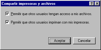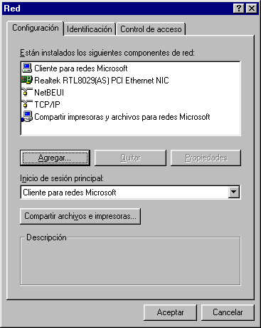 Para instalar estos protocolos, usaremos el método explicado al final de esta página, pero en la mayoría de los casos, no será necesario, ya que TCP/IP nos permitirá realizar las tareas de red más interesantes. 3c-Configurar servicios de compartición, indicar grupo de trabajo y dirección IPSi deseamos que nuestro ordenador pueda compartir sus carpetas e impresoras con los demás equipos de la red local, lo activaremos mediante el botón "Compartir carchivos e impresoras":