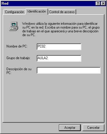 En la segunda ficha de las propiedades de la red (Identificación), escribiremos el nombre que deseamos dar a este ordenador en la red, y el grupo de trabajo al que pertenecerá. Si queremos que varios de los ordenadores de la red puedan intercambiar datos con mayor comodidad, deben tener el mismo grupo de trabajo.