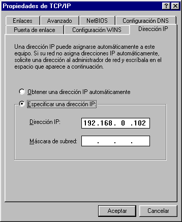 Volviendo a la primera ficha (Configuración), haciendo doble clic sobre TCP/IP, teclearemos la dirección IP que queremos asignar al ordenador.