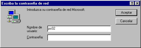 Si nuestra red se va a conectar a Internet, usaremos una del tipo: 192.168.0.X, donde X va de 1 a 254. Esto nos permite crear una red de hasta 254 ordenadores, más que suficiente para cualquier red doméstica o de una PYME. No es necesario que estos números vayan seguidos, pero sí que compartan la parte inicial: "192.168.0." Si la red no se va a conectar a Internet, podríamos usar otra numeración diferente, pero en todo caso, debemos conservar iguales los 3 primeros números. Después de reiniciar, la red ya debería funcionar 3d-Comprobar que funciona la redA partir de ahora, cuando se encienda el ordenador, aparecerá la siguiente ventana. No es necesario escribir una contraseña, pero es importante que se pulse la tecla INTRO (o el botón aceptar). Si se usa el botón de cancelar o cerrar (x), no se estará entrando en la red, por lo que este ordenador no estará conectado a los demás.