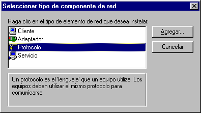 3e-Cómo instalar otros protocolos de redPodríamos instalar otros protocolos además del TCP/IP; por ejemplo, el Netbeui. Todos ellos son compatibles entre sí, y cada aplicación usará uno u otro en función de sus necesidade sy de cómo sesté configurada. Para instalar un nuevo protocolo, usa el botón derecho en "entorno de red", elige "Propiedades", y luego el botón "Agregar...":