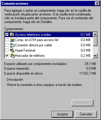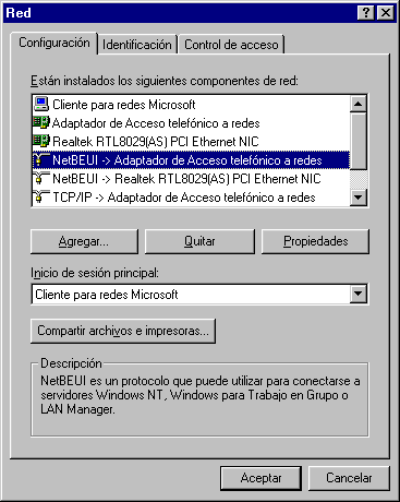 Instalar el Acceso telefónico a redesDesde "Mi PC - Panel de Control" entramos en "Agregar o Quitar Programas": Aparecerá la lista de programas instalados en el ordenador: Elegiremos la ficha "Instalación de Windows" y aparecerá el siguiente mensaje de espera: y tras unos segundos, la siguiente pantalla: Haciendo doble clic en la palabra "Comunicaciones" (ojo, no en la marca "v" de la izquierda), saldrá: Aquí activamos la "v" de "Acceso Telefónico a Redes", y comenzará la copia de los archivos necesarios, pidiéndonos el CD-ROm de Windows si es necesario: Una vez terminado, debemos reiniciar el PC: Una vez reiniciado, pulsamos botón derecho en "Entorno de Red", y elegimos "propiedades": Veremos que el adaptador de acceso telefónico a redes está instalado, como si fuera otra una tarjeta de red. En el ejemplo, además del modem, disponemos de una tarjeta de red marca Realtek; cada protocolo instalado aparece en dos versiones; una para el acceso telefónico a redes y otra para la tarjeta de red. Por problemas de seguridad, para evitar que otros internautas puedan acceder a tus carpetas compartidas, conviene quitar el protocolo NetBeui del adaptador de acceso telefónico a redes (si es que estaba). Se puede dejar el netbeui de la tarjeta de red, que no será usado por los internautas, sino sólo por la red local. De hecho, TCP/IP cubre las necesidades de acceso a internet y otras de una red local, por lo que no es necesario disponer de Netbeui ni otros, que se pueden quitar. Instalar el Protocolo TCP/IPPueden aparecer dos versiones de TCP/IP: una para la red local (si existe), y otra para la conexión a Internet (indicada como "TCP/IP - Adaptador de acceso telefónico a redes") En la misma pantalla de antes, si no está TCP/IP, hay que instalarlo, mediante el botón "Agregar". TCP/IP aparece eligiendo antes el fabricante "Microsoft". Una vez aceptado, aparecerá el protocolo TCP/IP en la lista: Crear una Conexión a InternetEntraremos en "Mi PC - Acceso telefónico a Redes", y elegiremos "Realizar conexión nueva". Comenzará un proceso que nos creará un nuevo icono de conexión, dentro del acceso telefónico a redes. Tras pulsar "siguiente", daremos a la conexión un nombre que nos permita reconocerla con facilidad (si sólo tenemos una, podemos dejar "Mi conexión") Podemos crear tantas conexiones como deseemos (con proveedores diferentes); así en cada ocasión podremos conectarnos por la que mejor prestaciones ofrezca. En la siguiente pantalla, teclearemos el nº de teléfono de nuestro proveedor (no el de atención al cliente, sino el de Internet, tendrá un prefijo 908 ó 909) Escribimos el prefijo como código de área, y de nuevo en el nº de teléfono. Sólo queda pulsar "Finalizar": Aparecerá un nuevo icono de conexión, dentro del acceso telefónico a redes: Ahora cambiaremos algunos datos pulsando botón derecho sobre la conexión que hemos creado, y eligiendo "propiedades": Nos aseguramos de que el nº de teléfono lleve el prefijo (908 ó 909 en el momento de escribir este tutorial) También desactivamos la opción "Utilizar código de área y propiedades de marcado" Tras visitar páginas eróticas o de programas o música pirata, puede que este nº haya cambiado a un 906, y las conexiones a internet tendrán tarifa internacional, como ocurre en algunos servicios telefónicos eróticos. Este cambio se realiza a veces de forma maliciosa, sin el permiso previo del usuario, por lo que se recomienda comprobarlo frecuentemente, o utilizar un programa "antidialer". En la ficha "Tipo de servidor", dejamos todo como aparece aquí: Pulsamos el botón "Configuración TCP/IP", y según nos indique nuestro proveedor, hacemos uno de los siguientes pasos: