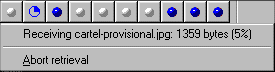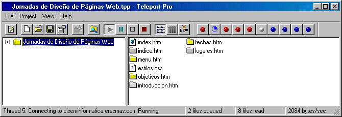 3-Comenzar la descarga de un sitio web con TeleportDespués de definido un sitio, según hemos explicado en el capítulo anterior (2-Definir la descarga de un sitio Web con Teleport), para comenzar la descarga (o continuarla, si no terminamos en la sesión anterior), basta con usar el típico botón de "reproducir", en la pantalla principal de Teleport Pro. Por supuesto, para que Teleport Pro pueda descargar los archivos de un sitio web, debemos disponer de conexión a Internet, auqnue una vez terminado el proceso de descarga, el sitio web será visitable aunque estemos desconectados. Aparecerá la pantalla siguiente: En la parte superior derecha, aparecen una serie de bolas que muestran el progreso de la operación de descarga: Las que se tienen forma de bola roja indican que se está estableciendo la conexión, las bolas azules son archivos que se están buscando, y las que tienen aspecto de reloj indican que el archivo se está descargando, y la zona azul va creciendo según aumenta el porcentaje ya descargado. Si uno de los archivos que se están descargando es demasiado grande, o no nos interesa por cualquier otra razón, podemos detener su descarga pulsando el botón izquierdo sobre el "reloj", y elegir "Abort retrieval". también podemos, simplemente, ver cuál es el nombre del archivo, el número de bytes ya descargados, y el porcentaje que supone respecto del tamaño total: Cuando termina la descarga de todo el sitio, aparece un mensaje indicando cuántos archivos han sido leídos, y cuántos de ellos descargados. Algunos de los archivos leídos pueden no hacer sido descargados porque podemos configurar Teleport para que no descargue los archivos de un determinado tipo o tamaño. Tras aceptar esta pantalla, veremos la lista de archivos descargados: En la parte inferior derecha, veremos de nuevo el número de archivos leídos, y la velocidad a la que se ha producido la descarga del último archivo. Para ver las páginas que hemos descargado, podemos hacer doble clic en la página principal del sitio, que normalmente será index.html, index.htm, default.htm, home.htm, etc... Esa página aparecerá en la misma lista de archivos de Teleport Pro si no hemos cerrado la ventana, pero si queremos verla cualquier otro día, debemos ir a la carpeta donde habíamos guardado el archivo de proyecto (.TPP). allí veremos la estructura de carpetas que usó el programa para guardar los datos: Primero crea una carpeta con el nombre que le dimos al proyecto, y dentro coloca otra con la dirección del sitio que hemos descargado, y a su vez, dentro introduce las carpetas donde se hallan los archivos. Recordemos que hemos realizado la descarga con la opción "Duplicar un sitio web manteniendo la estructura de carpetas". Si hubíeramos elegido en su lugar la opción "Crear en nuestro disco duro una copia navegable de un sitio web", todos los archvios aparecerían en la misma carpeta, con un nombre cambiado si fuera necesario, pero en todo caso, perfectamente navegable. Dentro de la carpeta final ("jornadasweb") veremos los archivos que han sido descargados, y podríamos verlos en nuestro navegador, haciendo doble clic en el archivo "index.html".