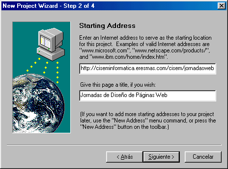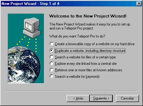 2-Definir la descarga de un sitio Web con TeleportSupongamos que deseamos descargar la siguiente web: www.cisem.org/cisem/jornadasweb/ que contiene información sobre las I Jornadas de Diseño de Páginas Web de CISEM La barra del final es necesaria cuando no indiquemos un nombre de archivo. Si no la escribiéramos, el programa leería un sólo archivo, llamado jornadasweb.htm. También podríamos haber usado esta otra URL: www.cisem.org/cisem/jornadasweb/index.html NOTA: La dirección www.cisem.org es un nombre de dominio redireccionado al sitio http://ciseminformatica.eresmas.com, que es donde los datos se encuentran realmente alojados. Por eso, para que Teleport Pro funcione adecuadamente, debemos usar la dirección http://ciseminformatica.eresmas.com/cisem/jornadasweb/index.html en vez de www.cisem.org/cisem/jornadasweb/index.html. Para mayor facilidad y comodidad, usaremos el asistente, que nos permitirá definir la descarga en 4 pasos: 1) Elegir el tipo de descarga que deseamos:Elegiremos la 2º opción, que significa "Duplicar un sitio web manteniendo la estructura de carpetas". Las opciones significan lo siguiente: