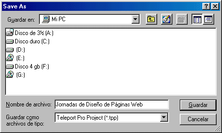4) Para terminar, el programa nos felicita y nos indica que comencemos la descarga usando el típico botón de "reproducir".Aparecerá la siguiente pantalla, que nos permitirá teclear un nonbre para el proyecto, e indicar la carpeta donde queremos guardarlo. Teleport nos propone la primera palabra del título que hemos tecleado en el paso 2, pero en este ejemplo, hemos preferido teclear: "Jornadas de Diseño de Páginas Web". Los archivos descargados se almacenarán en una carpeta nueva, con el nombre que hemos tecleado aquí, y que estara dentro de la carpeta que hayamos seleccionado.