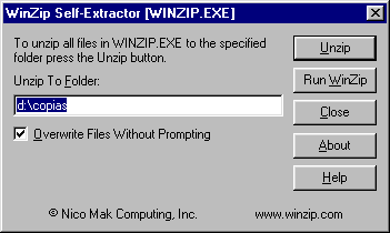 Un archivo autodescomprimible es un archivo comprimido que no necesita el programa WinZip para ser descomprimido. En vez de tener extensión .ZIP es un programa ejecutable, de extensión .EXE. |