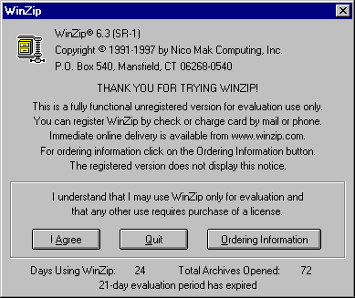 Entonces aparecerá la pantalla que nos recuerda que éste programa es shareware y que nuestro derecho de evaluación del producto sólo dura 21 días, y que transcurrido dicho plazo debemos comprarlo o eliminarlo de nuestro disco duro. |