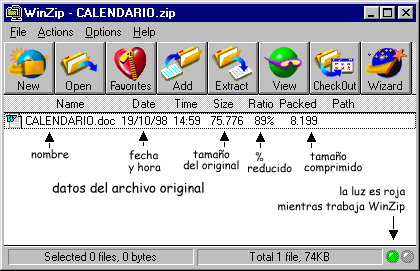 Para comprobar que el archivo comprimido contiene al original, basta con hacer doble clic al archivo comprimido, y aparecerá la pantalla principal del WinZip. |