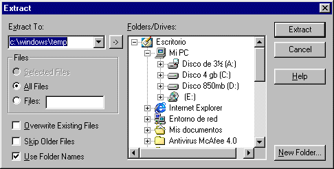 También podemos extraer sólo los ficheros que hayamos seleccionado (Selected Files), Todos (All Files) o los que indiquemos (Files:), por ejemplo, todos los archivos de Word: (*.doc) |